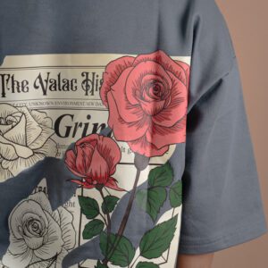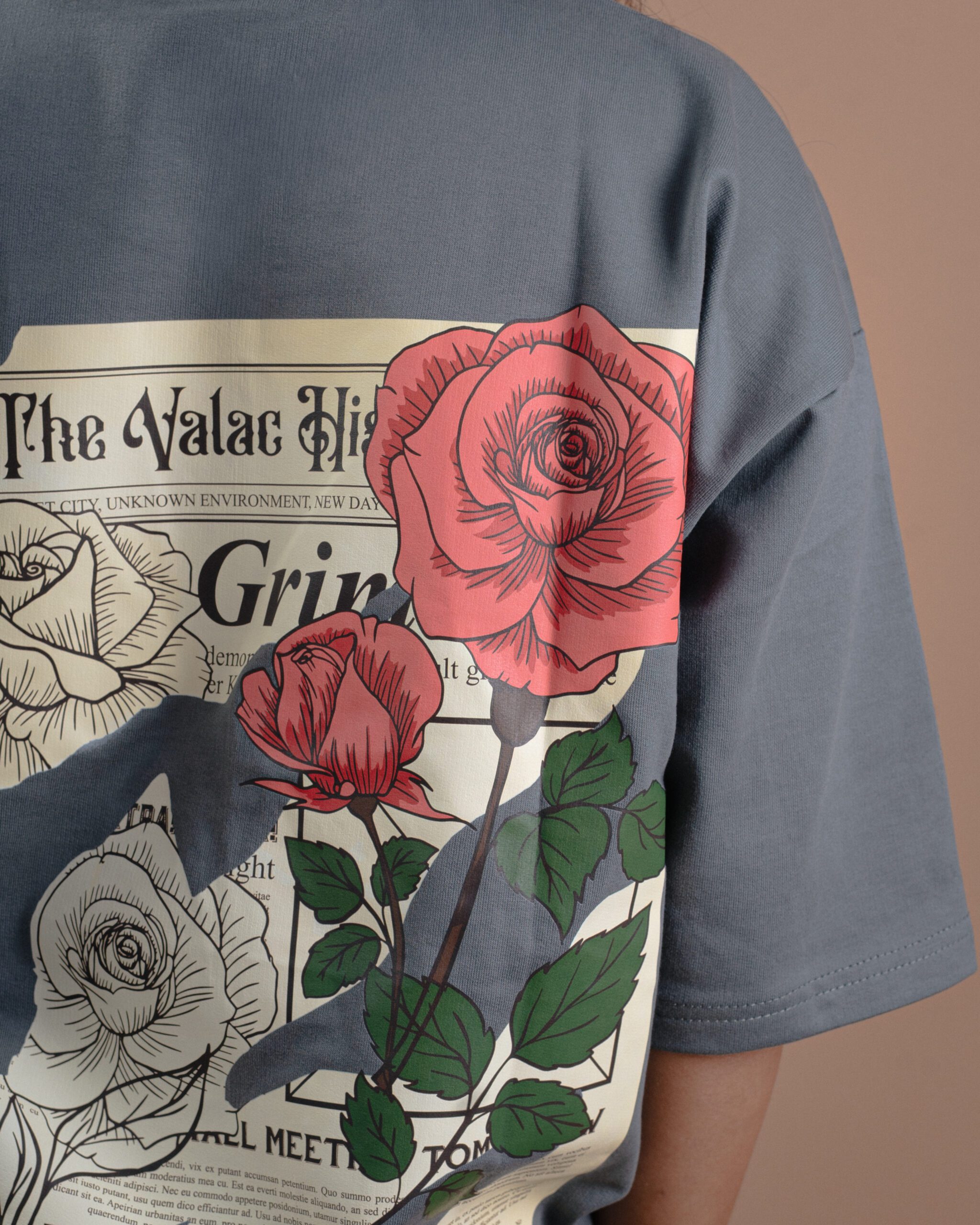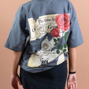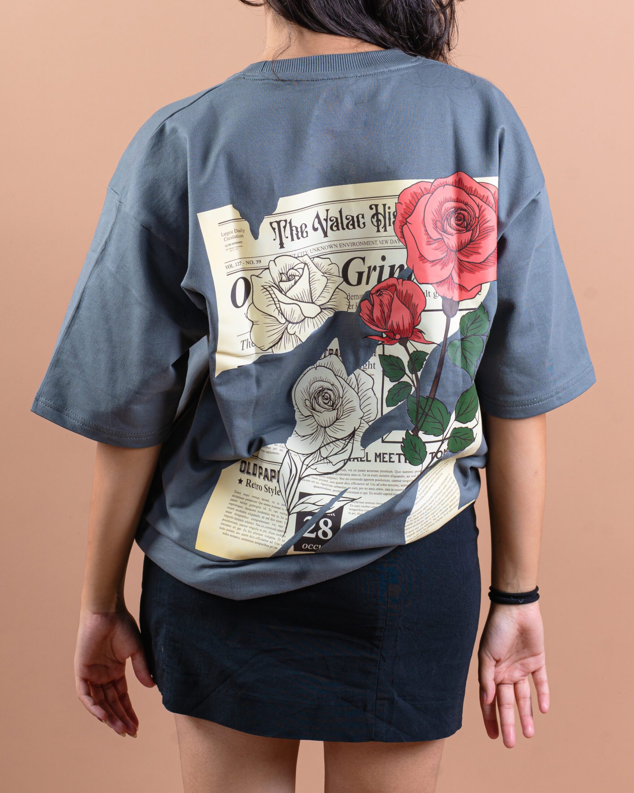 The Vintage Rose Newspaper Oversized T-Shirt captures the beauty of contrasts—soft roses blooming against raw newspaper prints, delicately hand-drawn yet bold in presence. Set on a washed black canvas, the back graphic blends retro textures with modern streetwear energy, creating a piece that feels timeless and effortlessly artistic.
